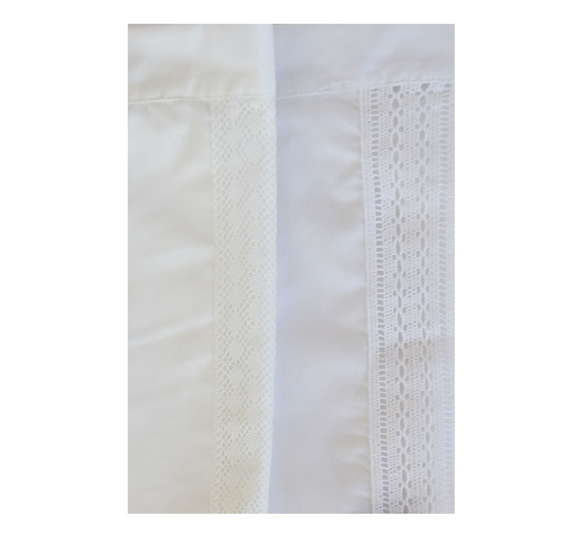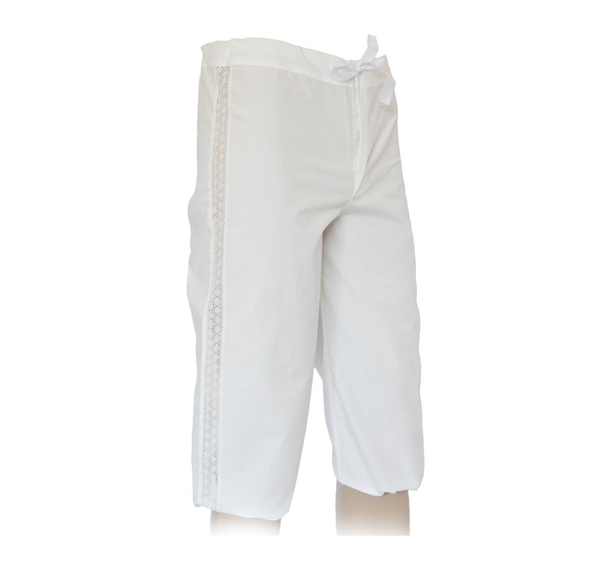 Es amplio y cómodo y se ajusta en la cintura y en los bajos con cintas. Presenta una puntilla mercerizada en los laterales que le dan un toque especial.